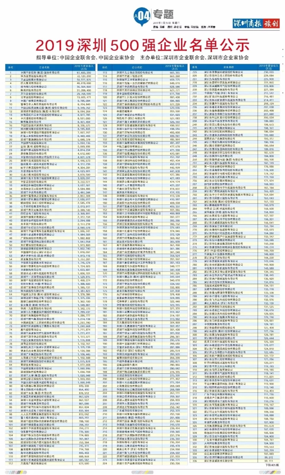 2019年“深圳500強(qiáng)企業(yè)”評(píng)選遵循國(guó)際通行規(guī)則,從營(yíng)業(yè)收入、稅收、凈利潤(rùn)、總資產(chǎn)、研發(fā)創(chuàng)新和企業(yè)規(guī)模等方面對(duì)企業(yè)進(jìn)行綜合評(píng)價(jià),并以營(yíng)業(yè)收入作為500強(qiáng)名單的最終排序依據(jù)。旨在集中展示深圳經(jīng)濟(jì)發(fā)展成果,全面反映深圳企業(yè)發(fā)展現(xiàn)狀,增強(qiáng)各界對(duì)企業(yè)社會(huì)價(jià)值的廣泛認(rèn)知,提升企業(yè)品牌知名度。